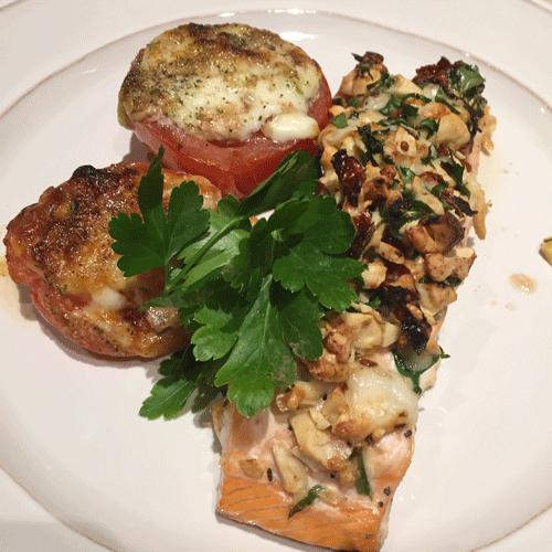 Det här passar bra om man vill äta mat med mindre kolhydrater. Lax med nötter, persilja, vitlök, ost, salt och peppar och tomater med buffelmozarella.