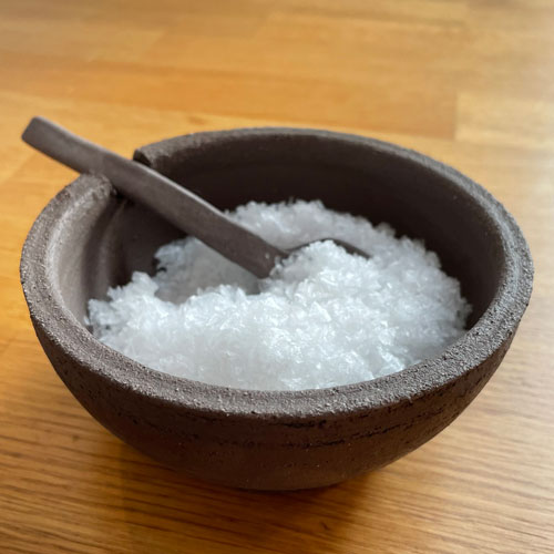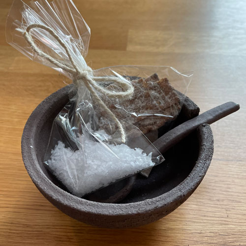 En saltskål med sked blev det, hoppas att det kan falla vår kund i smaken, (förr gav man bort salt och bröd för att inget skulle fattas de nyinflyttatde!)