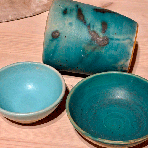 I de två skålarna har jag blandat i tenn, kvarts och zink och fått en lite glansigare glasyr men med två olika nyanser. Jag är inte riktigt nöjd än, men det är bra mycket bättre än vad den var från början.